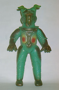 ミドルサイズ これは『ウルトラマン』の最終回に 登場したゼットンではなく、 『帰ってきたウルトラマン』の最終回に 登場した2代目ゼットンの人形なので、番外として紹介する。 ずいぶんブサイクな体形の人形だが、 実物の着ぐるみの拙い出来を 馬鹿正直に再現してしまっただけで、 軽率なデフォルメがされているわけではない。 見てすぐ2代目だとわかる、リアルな造形である。 それにしても、 最終回と言えばゼットン、という発想で 『帰ってきたウルトラマン』の最終回にも登場してしまうほど、 ゼットンという怪獣の印象は強烈だったというわけである。 |