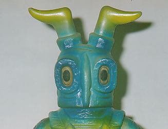 ミニサイズ すべてのサイズの中で、 最も着ぐるみに忠実な表現がなされた造形だと思う。 秤で重さを量ってみたら14グラムしかなかったが、 重量感を感じるたたずまいだ。 最も小さく最も軽い人形が、 最も力強い雰囲気を出したりするところが、 アンティークソフビのおもしろさのひとつでもある。 |