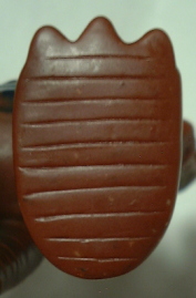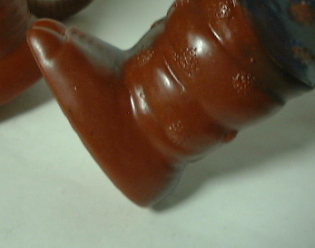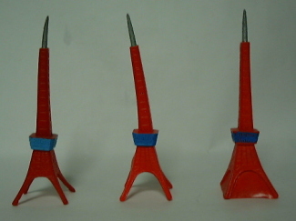 バラゴンをはじめとする、 ブルマァクのジャイアントサイズの怪獣人形には、 このように手に持たせて遊ぶために 東京タワーのソフビが付属しているものがある。 袋入りのデッドストック品でない限り、 紛失しまっている場合がほとんどなのだが、 やっかいな事に、 この付属の東京タワーソフビにも、 バージョン違いがあるのである。 僕が確認したところでも、 下の写真のように、 成形色および塗装色が違うもの、 下部のバリが除去されていないもの、 が存在している。 |