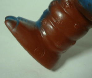 | ちなみに、向かって右側の人形は、 手(バンザイしている2本の足)が、 左右同じ型のものが誤って取り付けられている。 当時、と言うか、ブルマァクには、よくある事です(笑)。 |