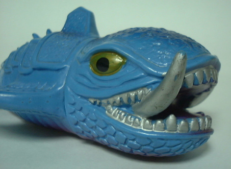 | 劇中のサンダーゲイは、クジラそのものの姿をしているので、 それとはかなりイメージが異なる人形である。 でも、 いかにも下品でダサいこの顔は、 ちゃんちゃこの歌にも大瀧詠一さんの歌にも似合わない。 間違いなく、悪者・サンダーゲイなのだ(笑)。 以前、 第4回「身震いするほど夢を見る 〜増田屋スペクトルマンの魅力〜」の中でも述べた事だが、 スペクトルマン怪獣を ブルマァクではなくてマスダヤがソフビ人形化したのは、運命的な生理の一致である。 ウルトラ怪獣と比べると、 スペクトルマン怪獣は安っぽくてえげつない。 そこが、マスダヤの鈍臭いセンスとピッタリ合うのだ。 美しさやカッコよさで子供の目を惹くブルマァクの表現には無い、 マスダヤ独特の野暮ったさが その造形や彩色に垣間見られた時、 スペクトルマン怪獣の人形は俄かにその存在感を強調しだし、 アンティークソフビとして、実に魅力的な輝きを放つのである。 たとえば、このサンダーゲイならば、 品の無い顔の表情はもちろんの事、 無理矢理はえてる牙から ウソくさい仕上がりのウロコまで、見事なまでの粗雑さ。圧巻ですらある。 |