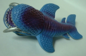 | 極めつけは、 口の中と体の表面を 同じ色で塗装している無神経さ。 いかにもマスダヤである。 しかも、 その塗装は 人形のお腹側にしか施されていないので、 下から見上げない限り、それに気づく事はない。 空飛ぶ鯨サンダーゲイの人形なのだから、 下の写真のように 空を飛ばせて遊んだ時に初めて、 そのマスダヤらしい彩色センスがわかる、 というところがミソ。 ・・・深いなぁ(笑)。 |
