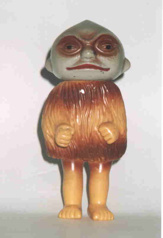 油すまし 『妖怪大戦争』では、 異国の吸血妖怪ダイモンと戦う日本妖怪軍団の リーダー格的存在として描かれ、 まさに妖怪界のヒーローだった。 僕が最も好きな妖怪である。 人形はどう見ても、 実物同様に杖を右手に持っているポーズなのだが、 別パーツで杖がついていたわけでもなく、 このポーズの主旨は不明。 だが、顔の表情は実物の特徴をよくとらえていて、 とても魅力的である。 高校一年生の時、或る日、 仲の良かったクラスメイトに、 「お前、油すましに似てるな」 と言われて、とても嬉しかった憶えがある。 たぶん目が似ているのだと思うけど、 当時僕は野球部で坊主頭にしてたから 余計似ていたのだろう。 化け物に似てる、と言われて喜ぶなんて おかしな話だが、僕は今でも、 自分の顔が油すましの顔に似ている事に 誇りを持っている(笑)。 |