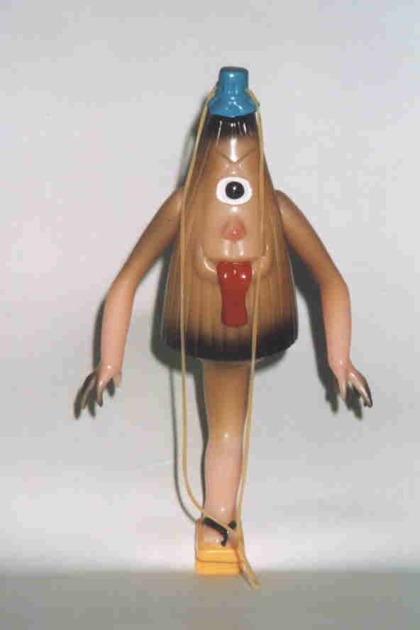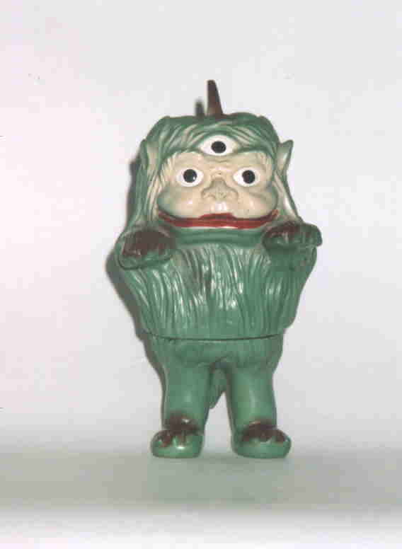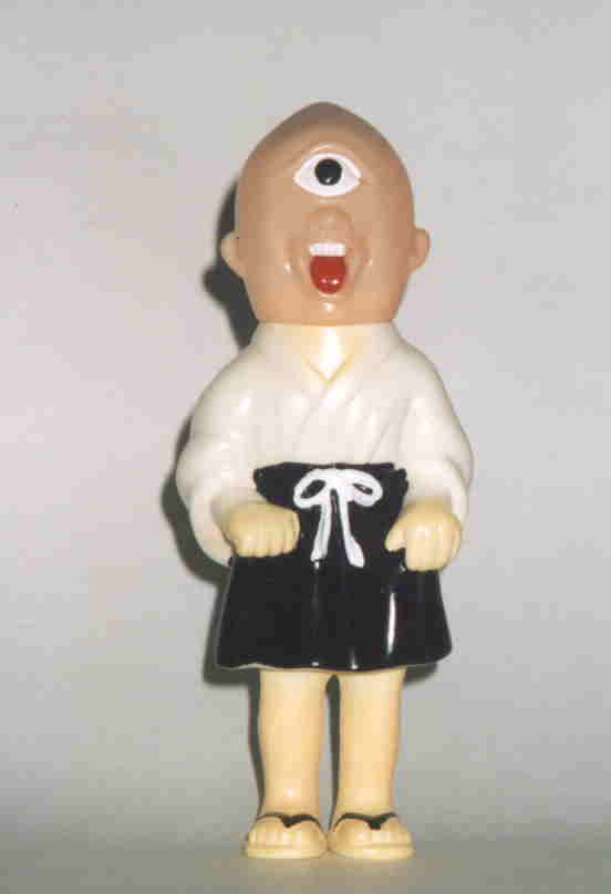 一つ目小僧 “妖怪は元々は神であった”とは、 民俗学者・折口信夫氏の説。 お化けと言えば “一つ目”というイメージがあるが、 昔は、「片目の者でなければ 神の霊智を映し出し得ない」として、 神官がわざと片目を潰して祭式を執り行う、 という風習があったらしく、 この一つ目小僧こそ、まさに、 神が零落した姿、なのかもしれない。 子供の頃読んだ少年雑誌に、 “一つ目小僧は、 片方の目をフライパンで焼いて食べるために ポケットにしまっているから、一つ目なのだ” と書いてあった。更に、 “ろくろ首の首が長いのは チューインガムを吐き出さずに たくさん飲み込んでしまったから” とも書いてあった。 ・・・子供だましにも程がある。 妖怪を馬鹿にしてはいけない。 きっと、この雑誌の編集者には 何らかのたたりがあったであろう(笑)。 映画に出てきた一つ目小僧は、 少年のような風貌だったが、 人形の方は、どう見てもオッサン顔である。 薄く吹き付けた頭部の塗装が妙にリアル。 |