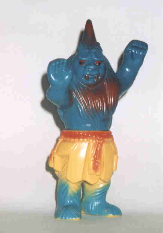 一角大王 スクリーン狭しとばかりに飛び回り、 怪力と俊敏な動きで迫力満点の立ち回りを 演じる戦闘型妖怪の人形らしく、 躍動感たっぷりの造形に仕上がっていて、 カッコいい。 子供の時唯一持ってなかった妖怪人形なので、 コレクターとなって 初めて手に入れる事が出来た時は、 長年の夢をようやく果たせたような気がして、 興奮した。 からかさや一つ目小僧のような 日本古来の妖怪なら、 郷土玩具を探せば、ソフビ以外の人形も 見つける事が出来るかもしれないが、 一角大王の人形となると、 日東科学教材が出したこの人形のみであろう。 貴重な存在だ。 顔が似ているので、青坊主とは兄弟だ、 と 子供の頃勝手に思い込んでいた。 “大王” という名、デカい角、恐い顔、 強そうな体格・・・、 男の子なら誰でもそのたくましさに 純粋に憧れる、スター的存在の妖怪だった。 |