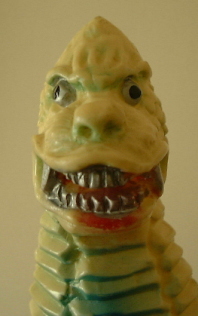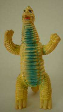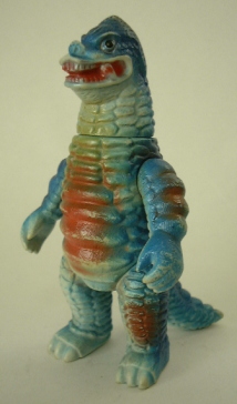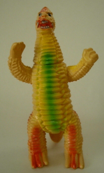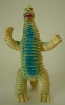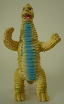 | ミドルサイズ 全長約12センチ。 スタンダード、ジャイアント、ミニの3サイズの人形よりも 発売(開発)時期が後のため、 マルサンテイストの造形を脱し、見た目が端正な怪獣人形を作ろうとする、 ブルマァクの意思が感じられる造形です。 このタイプのほかにも、 いろんなカラーリングの人形が存在するようです。 頑張って集めよっ、と。 |
