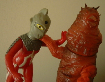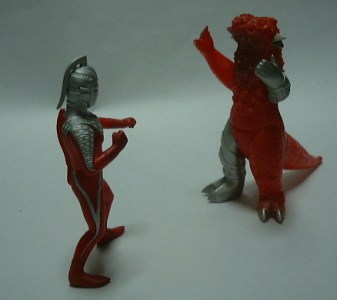 | バンダイ製、ウルトラ怪獣シリーズ。 全長約16センチ。 もちろん、 実物に似せたリアルな造形が求められる時代の商品なので、 ブルマァクの人形と違って、一目で改造パンドンと判る造形・彩色になっている。 |