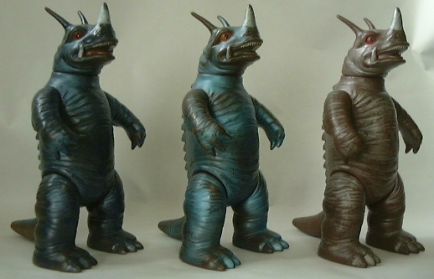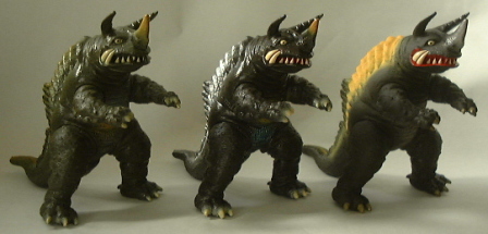 | そして、 よりリアルな造形へと進化していくのが、バンダイのウルトラ怪獣シリーズ。 平成7年に、 現在の、重量感満点の新造形にリニューアルされている。 下の写真の、向かって左端の人形が、それ。 真ン中の人形と右端の人形は、それぞれ平成12年と19年に、カラーリングが変更になって発売されたもの。 3体とも、 全長約21センチ、高さ約15センチ。 |