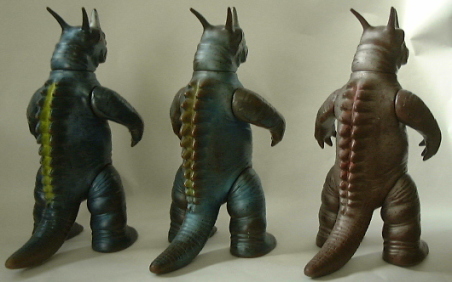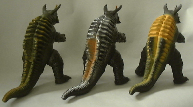 | “電気を食う” という特徴のイメージを膨らませて、 感電とか漏電とか、そんな危険な状態の心象を表現した彩色だったのだろうか?(笑) 3体とも、 成形色と高さは同じ(約12センチ)だが、 向かって右端の人形のみ、尻尾の長さが異なるので、 全長に差が出ている。 左端の人形と真ン中の人形は約19センチで、尻尾の長い右端の人形は約22センチ。 また、 左端の人形のみ、塗装色が異なる。 こういった違いを見つけ出し、揃えて所有するのが、ソフビコレクションの醍醐味なのである。 |