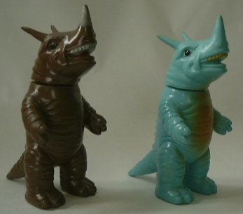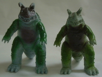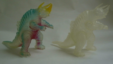 | こちらは番外編、 と言うか、 市販品の色を変えて限定発売する、という 平成ソフビの “お約束商品”。 ともに全長約21センチ、高さ約15センチ。 向かって左側の人形は、 平成10年に、 ウルトラマンフェスティバルの会場内で限定発売されたもので、 氷菓子みたいでなんだか涼しげなネロンガ。 右側の人形は、 平成11年に、 雑誌ハイパーホビーの誌上限定で発売されたもの。 |