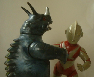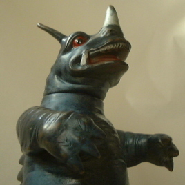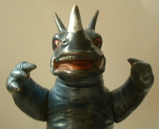 | それにしても魅力的だ。 充血しているようでちょっと恐い目、 舌を覗かせた、いたずら小僧みたくお茶目な顔の表情、 伝統的な力士の理想像・“あんこ” を思わせる、 でっぷりとしたお腹・・・etc. 怪獣という生き物の、 “迫力” と “愛嬌” を絶妙な加減で混ぜ合わせ、 かつ、全体から温もりが感じられる、という仕上がり。 マルサンソフビの素晴らしさが、ひと際胸に沁みる人形である。 |