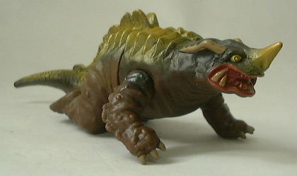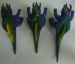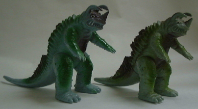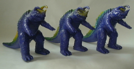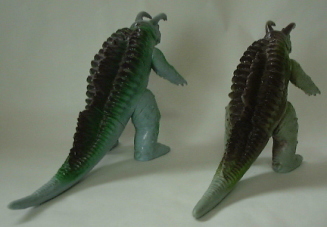 | マルサン製。全長約23センチ。 成形色は3体とも同じこげ茶色なのだが、 向かって左端の人形(初版)は、紺色でくるみ塗装を施し、そのこげ茶色が覆い隠されている。 これは、 パゴスの着ぐるみがネロンガの着ぐるみに流用されたのと同じで、 パゴス人形の頭部を挿げ替えてネロンガ人形にしてあるので、 それを誤魔化し、 パゴス人形とネロンガ人形をまったく別の人形に見せるための処置だったンだと思う。 下の写真、向かって左側がパゴス人形。 |