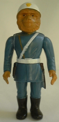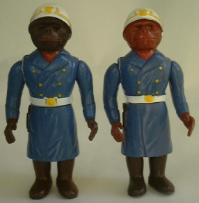 | 警察隊 隊員 全長約14センチ。 こういった、名も無き隊員たちや一般の民間猿など、 その他大勢のエキストラ猿を演じていたのは、 僕が以前に研究実習生として在籍していた劇団の人たちであった。 つまり、 猿の軍団は僕の大先輩。 個人的には、ちょっとした誇りである。 |