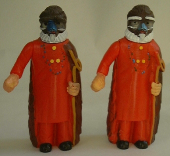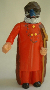 | 占い師サバト 全長約13センチ。 猿社会には、 ゴリラ族・チンパンジー族・オランウータン族の3大部族以外にも、 ヒヒ族とかマンドリル族とかテナガザル族とか、 そういった少数部族があり、 この占い師はマンドリルであると思われる。 作品世界にリアリティを持たせる効果の、一翼を担った存在であったと思う。 ただ、 ゴビー地方長官と並んで、 全26話中、確か2、3回しか登場しなかったマイナーキャラ。 当時の子供たちには全くウケなかった人形だと思うので、 その分、現在コレクターになった僕が、 いっぱいいっぱい 愛してあげています(ほとんど記憶に無いキャラクターなのですが(笑))。 |