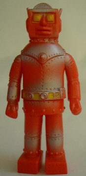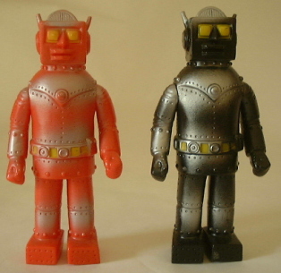 | そして、 このサイズではチップ人形に限り、 このように、カラーリングが異なるバージョンもある。 よって、 4体セットをひとつ買っただけでは揃わない、 というコレクター泣かせ(喜ばせ?)のアイテムである。 でも、 チップには ポップという瓜二つの兄(チップより先に造られたから)がいたので、 この2体を、“チップとポップ” と思って愛でれば、 これぞソフビ蒐集の妙味。 また、 足の裏には、 チップでもポップでもなく、“ロボット” とあるだけなので、 どちらをチップ、どちらをポップ、と思っても自由(笑)。 |