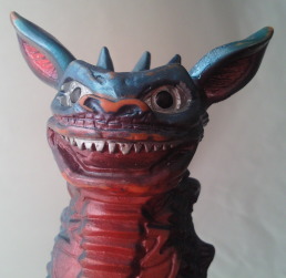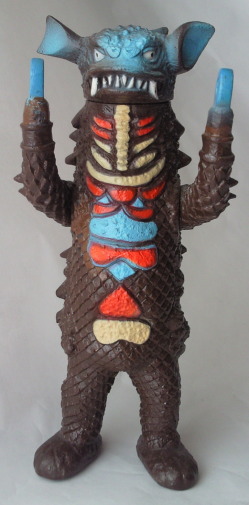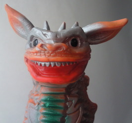 | こちらは、ポピー製のギャンゴ人形で、全長約17センチ。 なんと、片耳を傷つけられた状態で商品化されている。 ・・・そんな状態で人形にしてやるなよ、可哀想に。 ギャンゴの身にもなってやれっつの。 だけど、よくしたもので、 楽しそうな顔をしているマルサンギャンゴと異なり、 この人形は、 「冗談じゃないぜ、バカヤロ」とでも言いたげな、 フテくされた表情になってます(笑)。 |