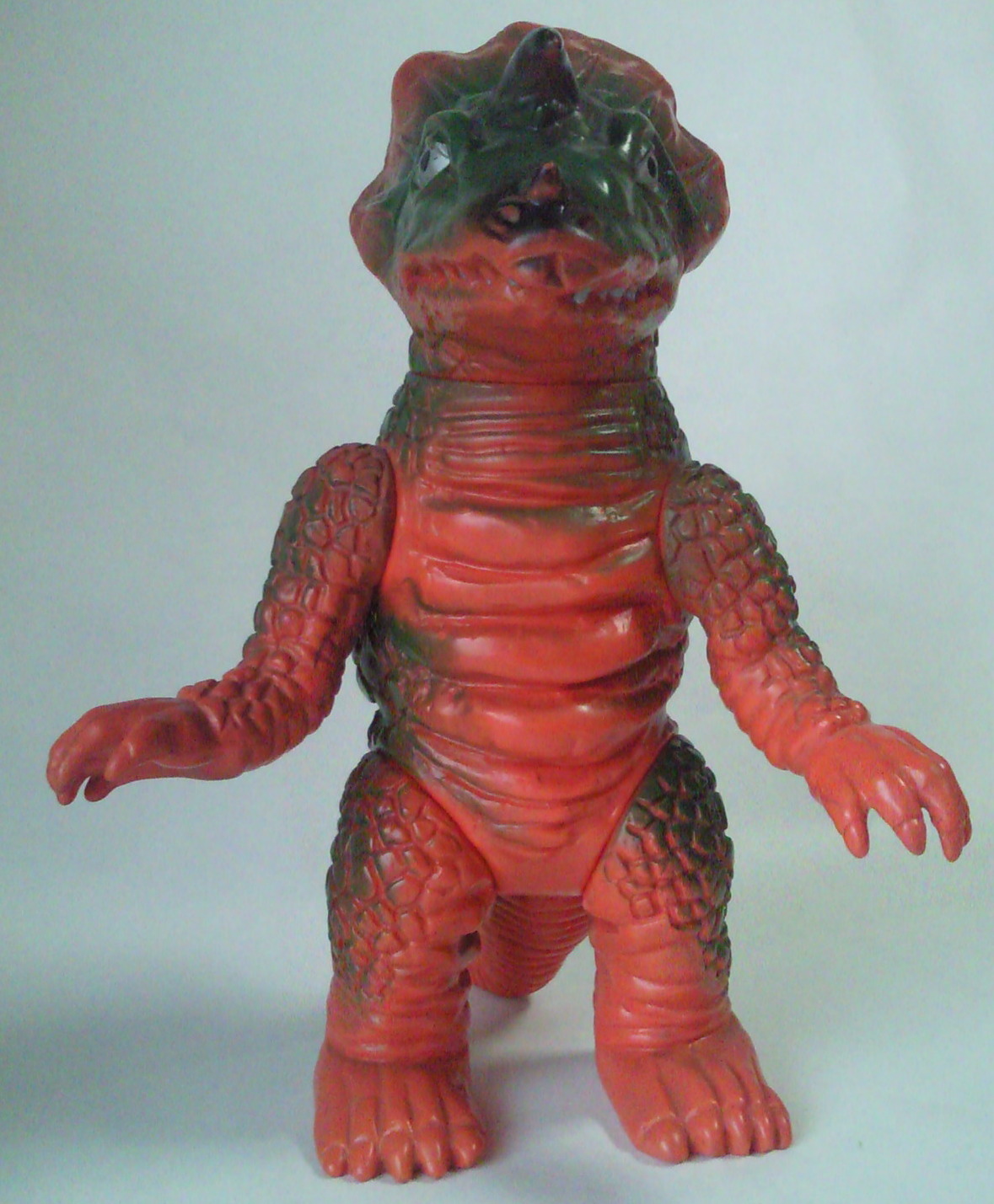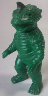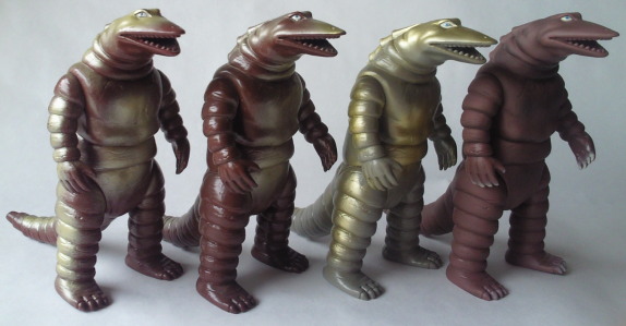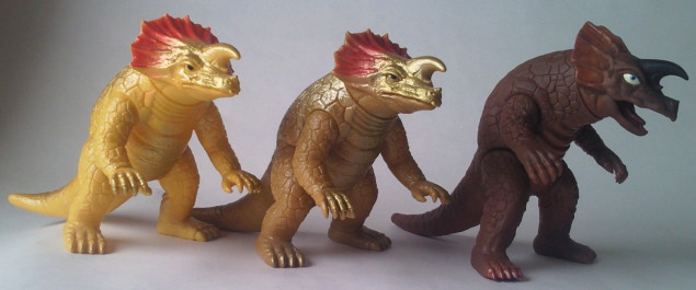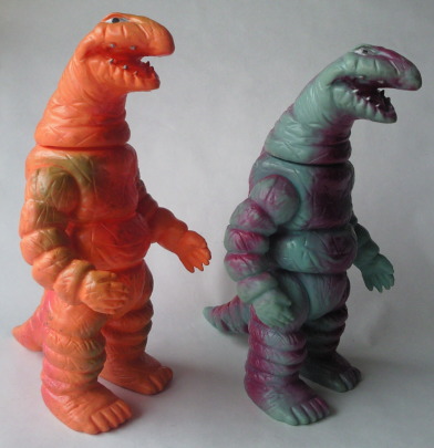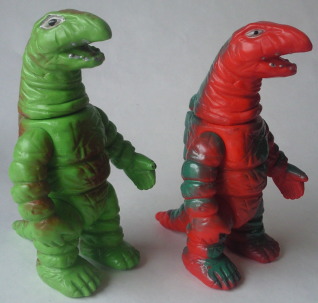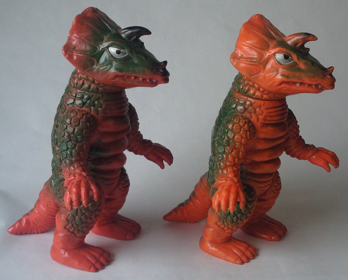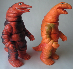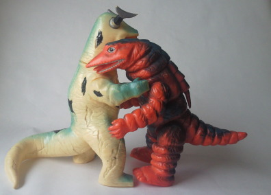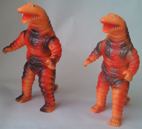この2体の差は、硬質ソフビか軟質ソフビか、の違い。 成形色も違って見えるけど、 たぶん、日焼けによるものだと思う。 |