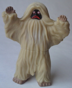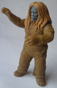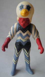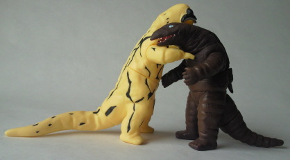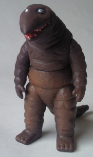 | その新撮された “怪獣プロレス” に登場した着ぐるみ怪獣たちの、 ミニソフビ(バンダイ製、全長約10センチ)。 マニアをターゲットに数年前発売された『ウルトラファイト』のDVDボックスに、 予約特典として付いていた人形である。 劣化した撮影用の着ぐるみ、 あるいは、 アトラクション用や宣伝用に作られた安っぽい着ぐるみの、 ヨレヨレ感・クタクタ感をリアルに再現した、思わず目頭が熱くなる(笑)造形だ。 |