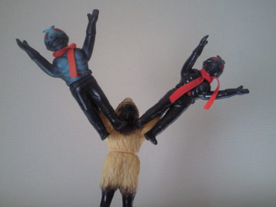 1号と2号のダブルライダーと、初めて戦ったショッカー怪人です。