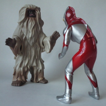 | ・・・あ、でも、 凍らせた帰りマンの手足を ばらばらに引き千切ったあの冷血な行為に、 “女性” を感じなくもないなぁ(笑)。 そう考えて改めてソフビを見ると、 ブルマァクならではのこの美しいフォルムが、 女性の肢体のたおやかさに通じているような気がしないでも・・・。 ・・・いかん、惑わされてる。 なるほど、 やっぱ雪女の怪獣だ(笑)。 |