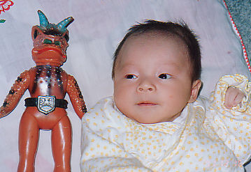 そして、最後の1枚は、ガマギラーのソフビ人形と、生まれて2週間の長男です。